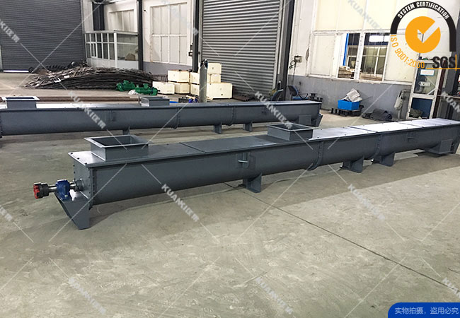 螺旋叶片将物料推移而进行螺旋输送机输送,使物料不与螺旋输送机叶片一起旋转的力是物料自身重量和螺旋输送机机壳对物料的摩擦阻力。螺旋输送机旋转轴上焊的螺旋叶片,叶片的面型根据输送物料的不同有实体面型、带式面型、叶片面型等型式。螺旋输送机的螺旋轴在物料运动方向的终端有止推轴承以随物料给螺旋的轴向反力,在机长较长时,应加中间吊挂轴承。